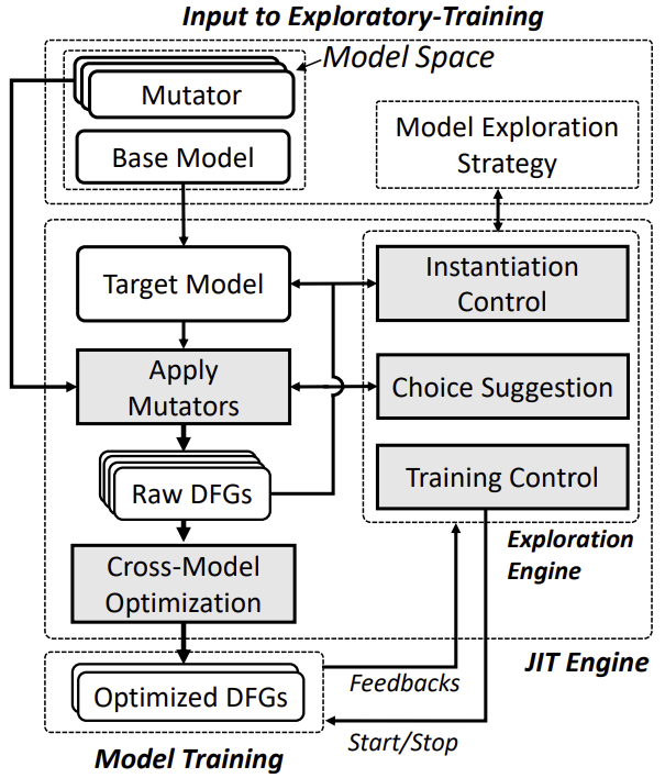 目前的深度学习框架只支持开发单个神经网络,然而这仅完成了整个探索性训练过程中的一步。另一方面,现有自动机器学习(AutoML)的方案如神经网络结构搜索(NAS: Neural Architecture Search)或超参数优化(HPO: Hyperparameter Optimization)缺乏可编程性和模块化,这使得一种 NAS/HPO 解决方案通常只能用在某一类神经网络结构上。此外,在探索性训练过程中很多神经网络结构是相似的,利用这些相似性有很多优化的机会可以加速整个探索性训练的过程。而现有的深度神经网络开发工具并没有系统性地利用这些相似性来加速探索过程。