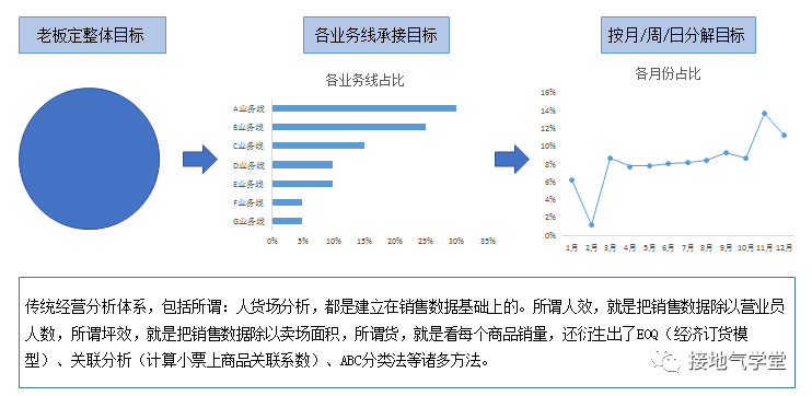 从抽样数据到全量数据,是一个质的变化。基于全量数据,可以直接管理到各个终端门店,直接基于数据作出经营决策。因此大部分企业的销售分析、经营分析、业务分析体系,都是在此基础之上建立起来的(如下图)。