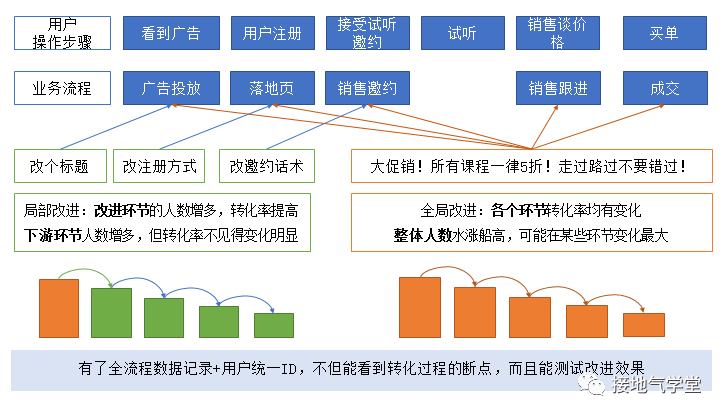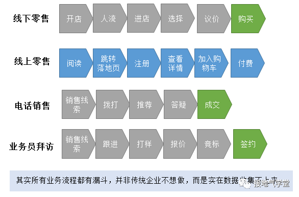 这个阶段的分析,是典型的知其然,不知其所以然的分析,大部分分析只能通过成交结果去猜。如果只有这个阶段的数据,想做深入分析,还是得依靠调研。比如传统企业想了解门店成交流程,会做门店调查,研究消费者在门店的动线,询问消费者体验。