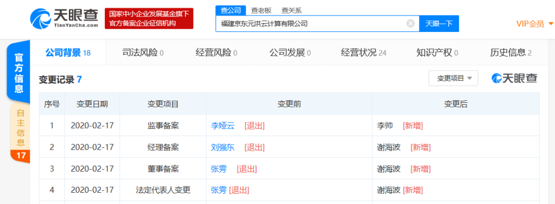 天眼查数据显示,2月17日,京东云计算全资子公司福建京东元洪云计算有限公司发生工商变更,刘强东卸任该公司经理一职,由谢海波接任。同时,刘强东助理张雱卸任该公司执行董事和法定代表人,仍由谢海波接任。