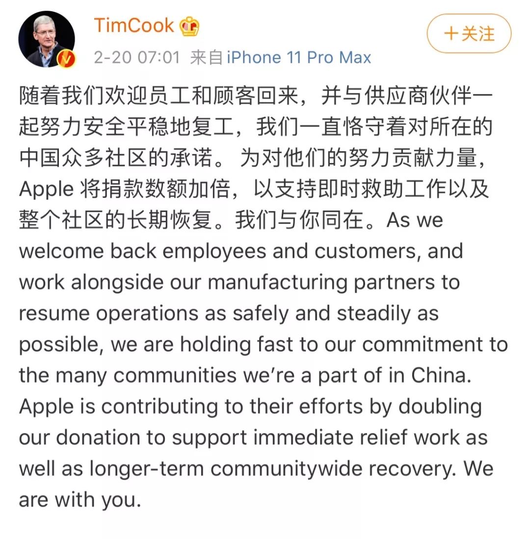 苹果CEO库克近日发布微博称,“随着我们欢迎员工和顾客回来,并与供应商伙伴一起努力安全平稳地复工,我们一直恪守着对所在的中国众多社区的承诺。为对他们的努力贡献力量,Apple将捐款数额加倍,以支持即时救助工作以及整个社区的长期恢复。我们与你同在。”