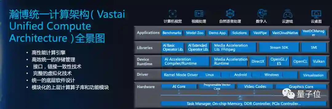 例如架构的底层整合了多款高性能计算引擎,包括高性能AI引擎、可编程的矢量计算引擎,还有硬件化视频解码、具备渲染能力的显示核心等。