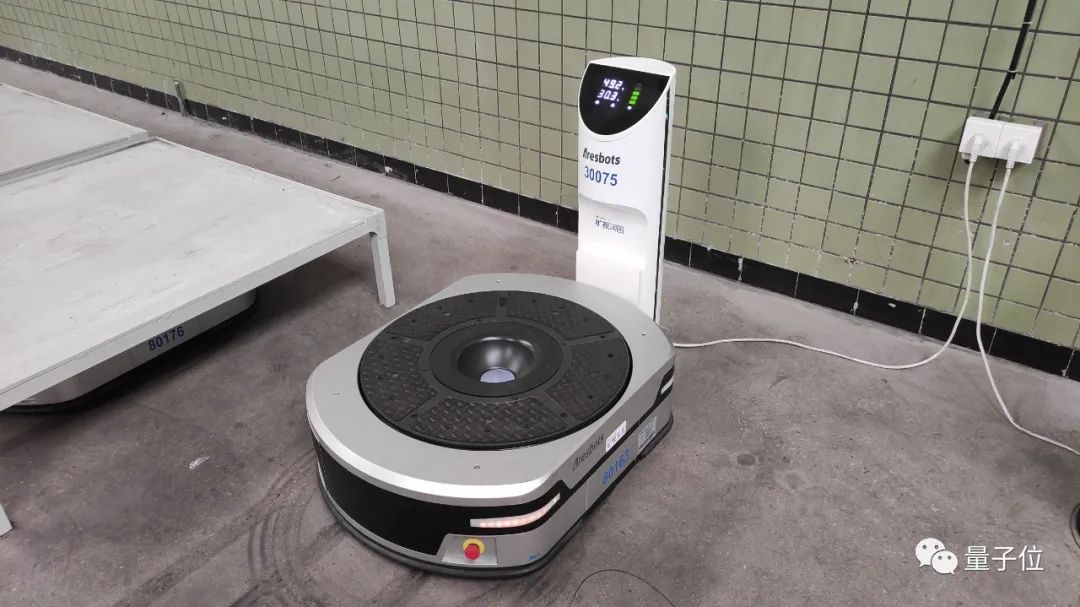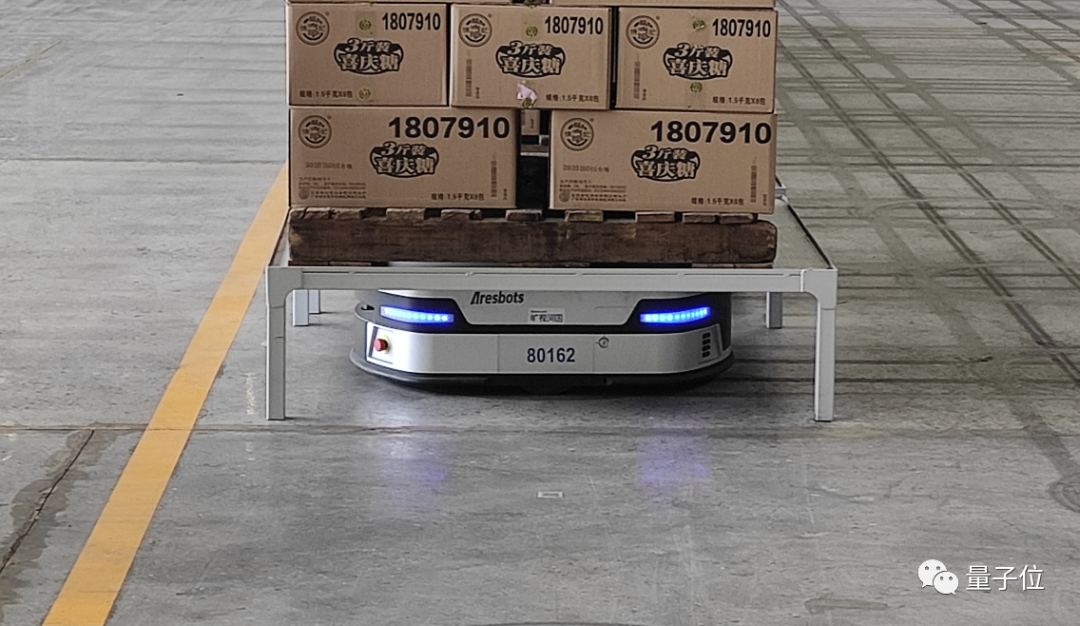 虽然机器人藏在货物架下面,但仔细找还是可以看到Aresbots的logo,就是旷视2018年全资收购的艾瑞思机器人。