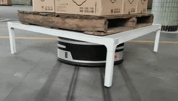 这些机器人可以自由的在货架下面游荡,背起货物行走,或是放下。