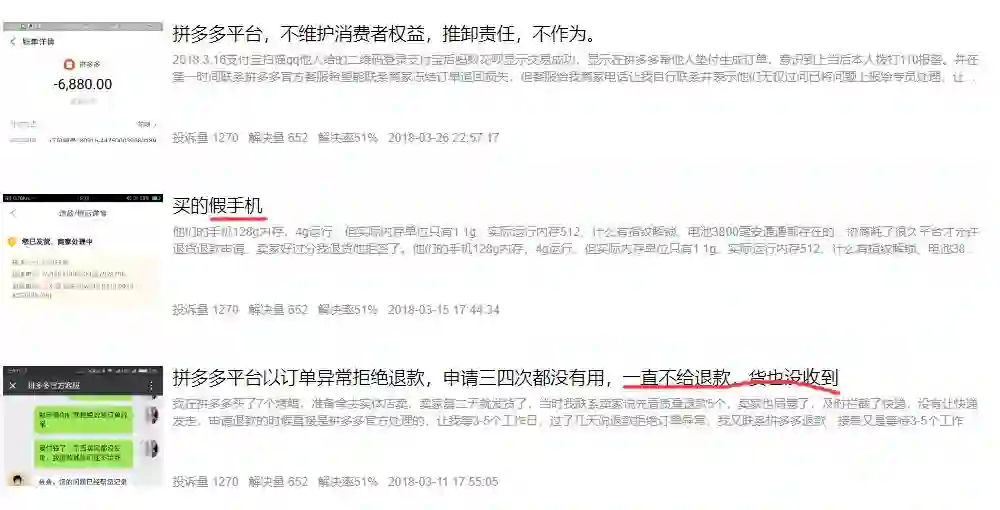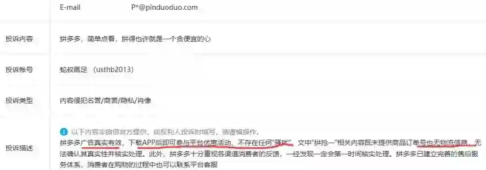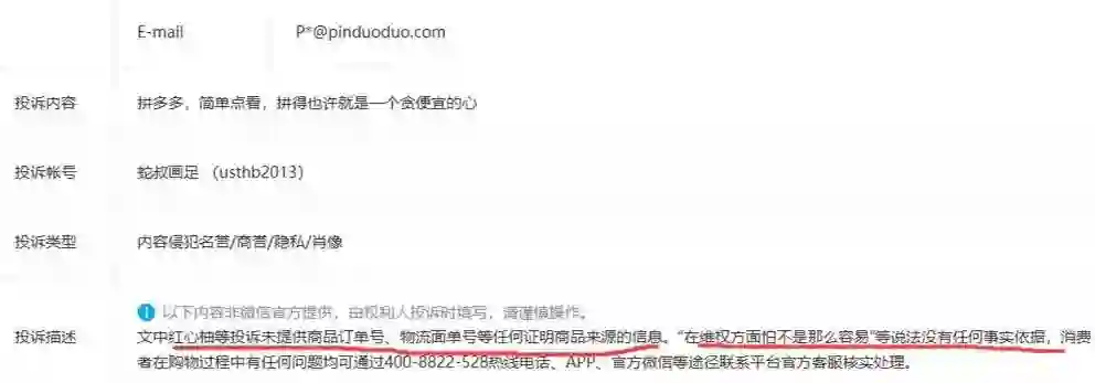2018年3月22日,一家看上去和拼多多没有什么关联的公司,对于笔者在微信公众号发表的《拼多多,简单点看,拼得也许就是一个贪便宜的心》进行了投诉,投诉的理由是“APP不存在骚扰,未提供商品订单号也无物流信息”。但是,笔者在文中所引用的案例和数据都是来自第三方公益维权投诉平台,而那里面的投诉,只要公开的,都是经过实名制核实的。因此,完全可以去对那些信息进行核实。