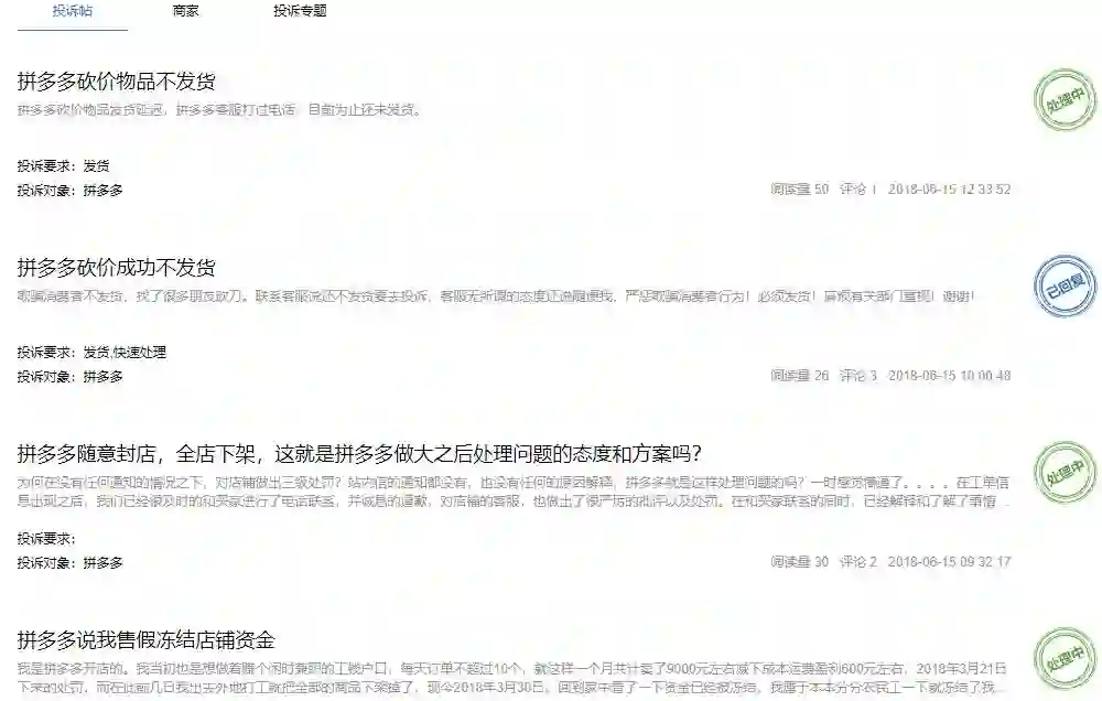 从3月22日那篇文章算起,到今天为止,不到3个月的时间,在第三方公益投诉维权平台上,针对拼多多的维权案件,无论是个人消费者,还是与其合作的商家,都在不断增加,而且维权的主张也是“丰富多彩”。归纳起来,有两类,一种是与拼多多的合作商家主要投诉拼多多蛮横乱处罚乱扣款乱压款。另一种是个人消费者投诉拼多多的商品品质和物流配送等。