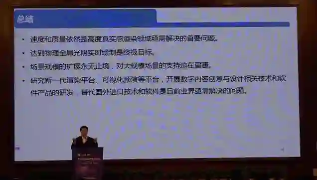 孟祥旭教授首先介绍了数字创意产业的问题与挑战。发展数字创意产业是国家战略需求,但核心支撑技术高实感渲染软件仍被国外垄断。目前急需寻求全局光照的并行求解方法,建立遵循物理规律的材质表达肌理以及解决超大规模场景数据组织和传序问题。