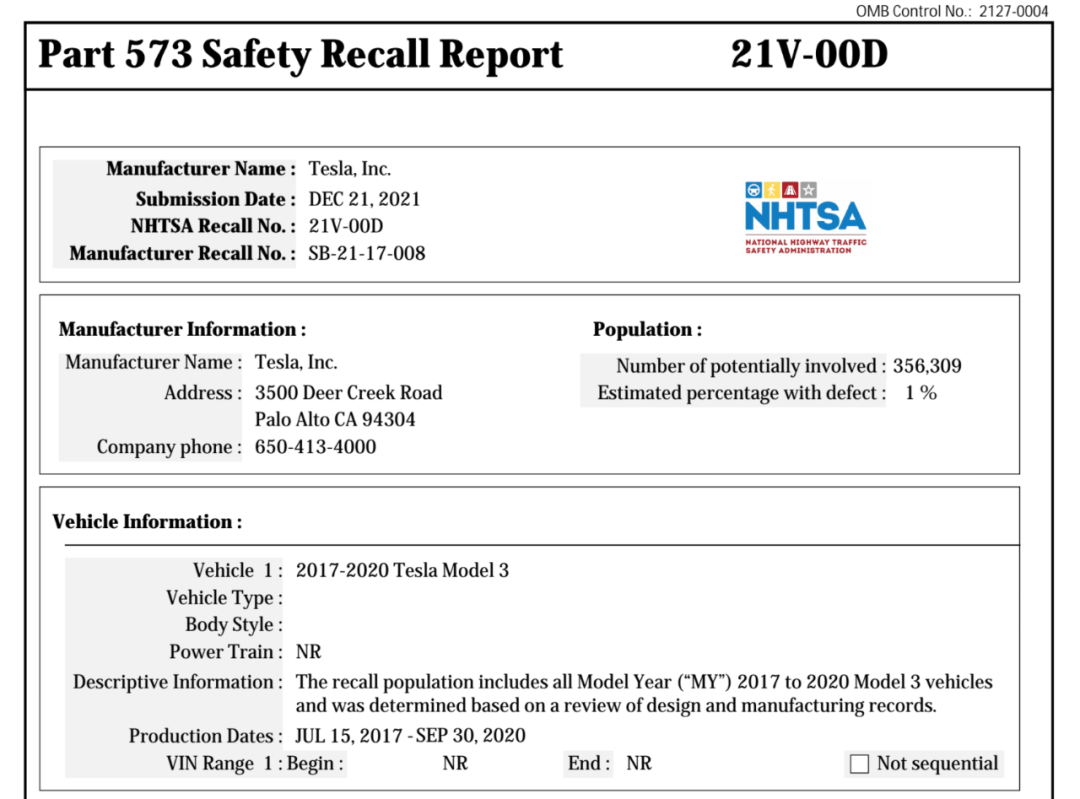 根据提交给美国国家公路交通安全管理局 (NHTSA) 的文件,本次共有 475318 辆汽车需要召回,其中 Model 3 汽车 356309 辆,Model S 汽车 119109 辆。特斯拉估计,只有 1% 的 Model 3 车辆会实际显示出缺陷,被召回的 Model S 车辆中出现缺陷的比例为 14%。