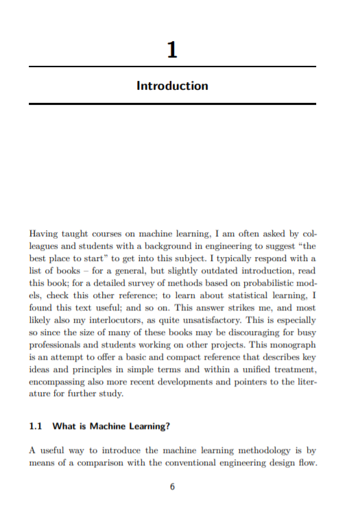 当我在教授机器学习课程时,有着工程学背景的同事和学生经常问及:如何更好地入门机器学习。我通常会以书籍推荐的形式回应——一般但稍微过时的介绍,请读这本书;对于基于概率模型方法的详细调查,请查看这些索引;如果想要了解统计学习,我觉得这篇文章很有用;如此等等。结果证明这些回答无法使我与提问者满意。书籍很多很厚,使得繁忙的工程学教授和学生望而却步。因此我首次撰写了这篇专论,一篇基础且体量适当的入门书,其中通过简单的术语面向工程师统一介绍了机器学习主要思想和原理,同时涵盖了其最新发展和文献指导,以供进一步研究。