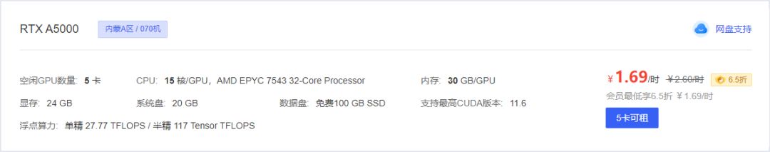 A5000很多同学可能都没听说过,但它一定会火起来!相比3090,同样是24GB显存,只在单精度算力上稍逊一筹,潮汐算力区还有同配置、定价1.58/h的A5000,真香。