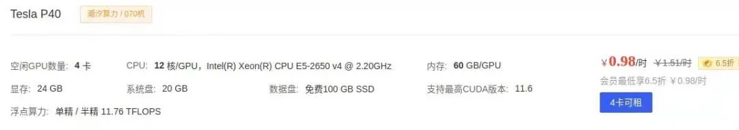 V100 作为上一代旗舰专业卡大家一定都很熟了,此为 NVLINK 版,租用多卡显存可线性拓展。