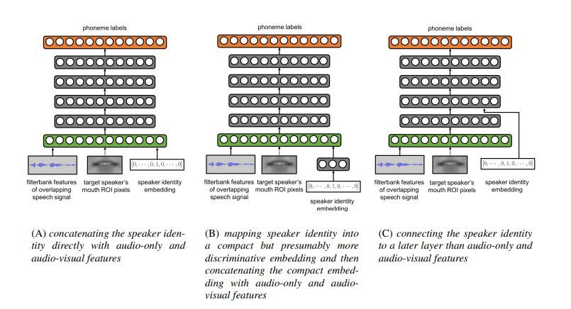 本文的语音特征并没有使用语音识别中常用的 MFCC,而是使用了 filterbank 特征,它在提取过程中与 MFCC 只差了一个离散余弦变换。而本文所使用的的视觉特征,是对原始数据中的图像做了基于 IntraFace 软件的人脸区域检测,然后把嘴部的原始像素用于视觉模态的特征,说实话,这样的处理可能有点粗暴。然后再添加说话人身份信息,这就是论文标题的 speaker-targeted 的所在。语音特征和视觉特征在输入到 DNN 之前就做了拼接,而说话人身份特征则在一组对比实验(图 2 中的 A、B、C)中做了不同层次的融合:A 是三者的直接拼接;B 是将说话人身份标签的 one-hot 编码做成一个 embedding,然后再和多模态特征拼接;C 是将说话人身份特征和较深层的多模态特征进行拼接。