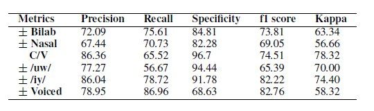 所用的数据集是 KARA ONE 数据集。论文中所述的第一、第二级别的模型都要进行单独的训练,相关的超参数如图 3 所示。其他相关的训练细节在论文第三部分都一一列举出来了。图 4 是 6 种音韵二分类的性能结果。图 5 是 11 种语音标记的分类性能。