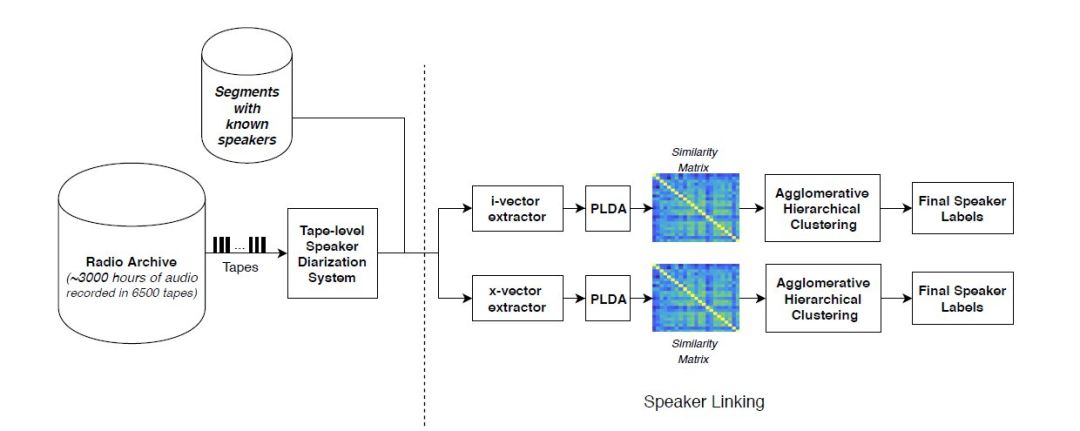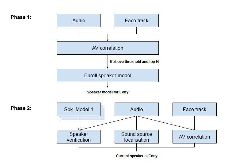 该方法包括两个不同的阶段,第一个阶段是录音带级别的分割,第二个阶段是说话人连接和识别。