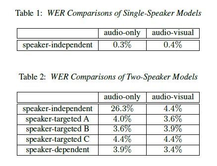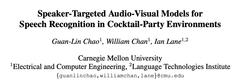 本文第一作者 Guan-Lin Chao 本科就读于国立台湾大学,目前在 CMU 电子与计算机工程系攻读博士学位。面对语音识别领域的「鸡尾酒」问题,本文作者提出了使用听觉-视觉模态融合的思路去构建以说话人为目标的声学模型。在模拟包含两个说话人的「鸡尾酒」环境中实现了显著的性能提升,听觉-视觉模型将错词率从本文的基线 26.3% 降低到了 4.4%,在引入说话人身份信息之后,进一步降低到了 3.6%。