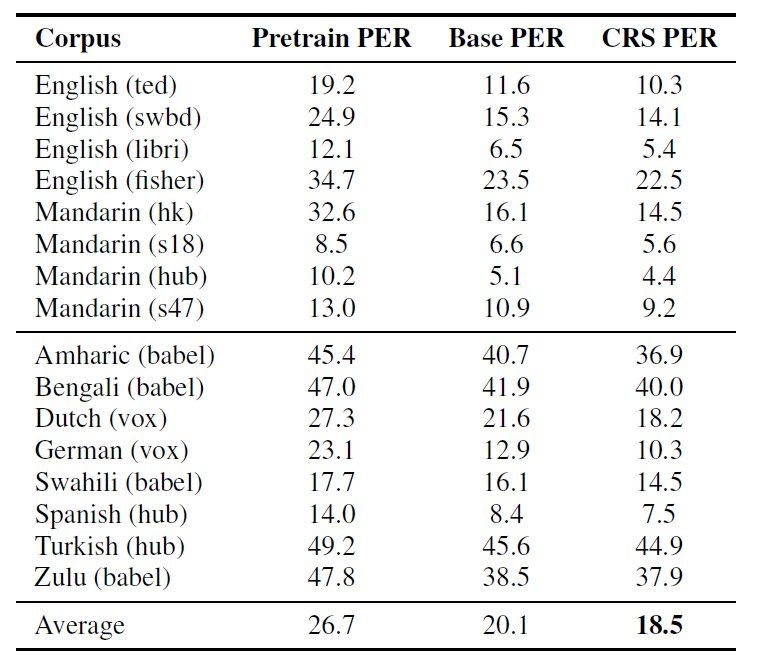 图 4. pretrained 模型、fine-tune 模型和预料相关采样(CRS)训练得到的模型的音素错误率比较