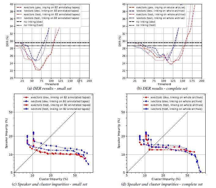 从图(a)和图(b)展示的结果可以发现,使用了说话人连接的方法,无论是只在标注过的数据上还是在整个数据集上进行连接,也不管是采用 i-vector 还是 x-vector 方案,其性能(DER)都要优于没有进行说话人连接的情况。而且两种连接方案都有对应的最佳聚类阈值。