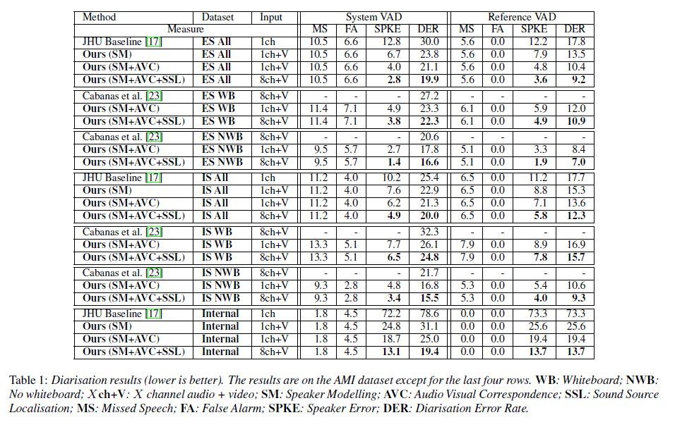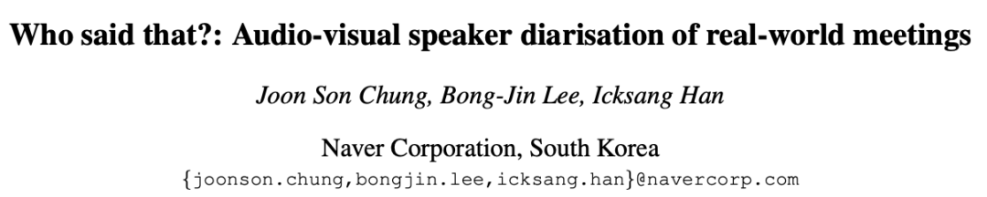 本文作者署名单位是韩国的搜索引擎公司 Naver[1],但是其他检索结果还显示 J.S. Chung 本人就读(职)于牛津机器人研究所。J.S. Chung 是一位技术牛人,他的个人主页以及 googlescholar 上展示了多篇高水平研究论文的发表 [2]。这篇论文的主要工作是一个基于听觉-视觉多模态的说话人分割系统。论文使用语音活动监测(类似于静音检测)、说话人身份建模(声纹&人脸)、多模态关联等技术得到了具有较好鲁棒性的说话人分割系统。系统在全景视频、单声道以及多声道的音频作为输入的现实会议数据中得到了很好的定量和定性的结果,也在公开数据 AMI 中进行了实验,测试结果超越了所有的对比方法。论文作者还提到,当数据是多声道音频的时候,波束成形方法和视频结合起来可以进一步提升性能。