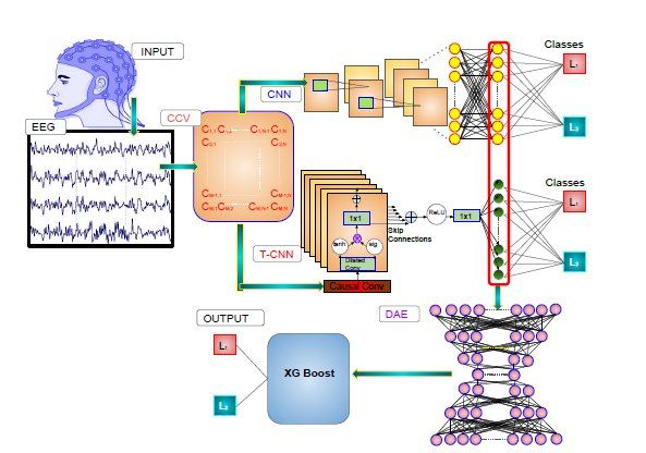 如图 2 所示,本文所提出的分级神经网络由三部分组成:a)CNN 与 TCNN 的结合,作为第一级别,用来识别 6 种音韵分类是否存在二分类结果,第一级得到的异构特征将会馈送到第二级别;b)第二级别是无监督的深度自编码器(DAE)。它的目标在于进一步降低上一级输出的空间-时间编码的维度,并且去除背景噪声效果。c)在第三级结构中,DAE 生成的隐含箱向量表征被送入基于 XG Boost 的分类器,并且以有监督的方式进行训练,用来预测脑电信号对应的语音标记的分类结果。