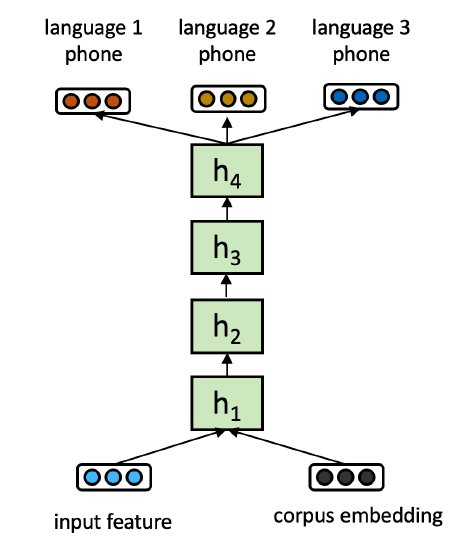 其中 x 是样本特征输入,e_i 是对应的语料 embedding,W 是声学模型的参数,这里所用的声学模型是多语言 CTC 模型,它由 6 层双向 LSTM 组成。