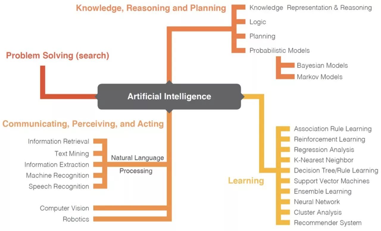 我们把上面列出的 23 种技术根据它们在人工智能领域内的基本机制、方法和应用相似度进行了分类。这些分类并不是互斥的。你可以将它们看作是人类具有的能力,每种能力都有不同的功能,共同协作才能实现更高级更复杂的目标。