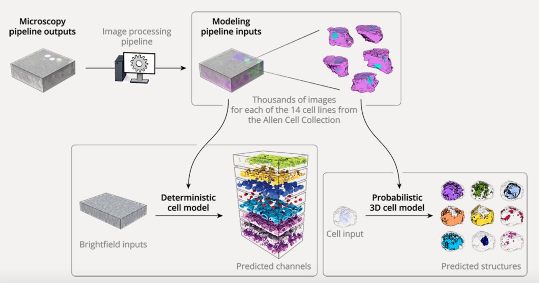 在微软联合创始人保罗·艾伦的资助下创立的艾伦细胞科学研究所(Allen Institute for Cell Science)最近公布了一项研究成果,利用卷积神经网络(CNN)等 AI 算法学习现有的 2D 及 3D 细胞影像资料,训练出了两套能够精准展示和预测细胞各部分形状、位置及工作状态的算法模型,一个叫确定性模型(deterministic model),一个叫概率模型(probabilistic model)。