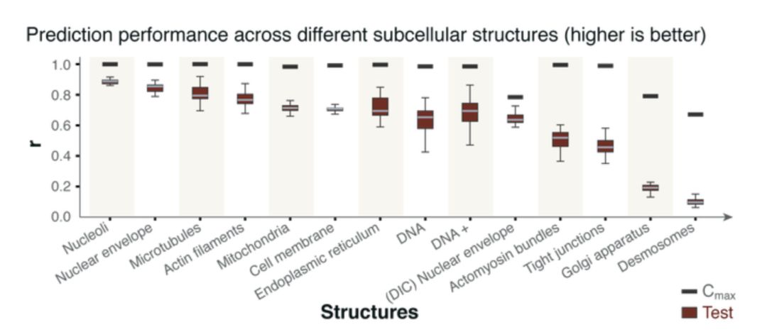 从图上看,细胞核、核被膜等蛋白质的可信度比较高。换句话说,AI 模拟出的细胞活动与观测数据误差很小。