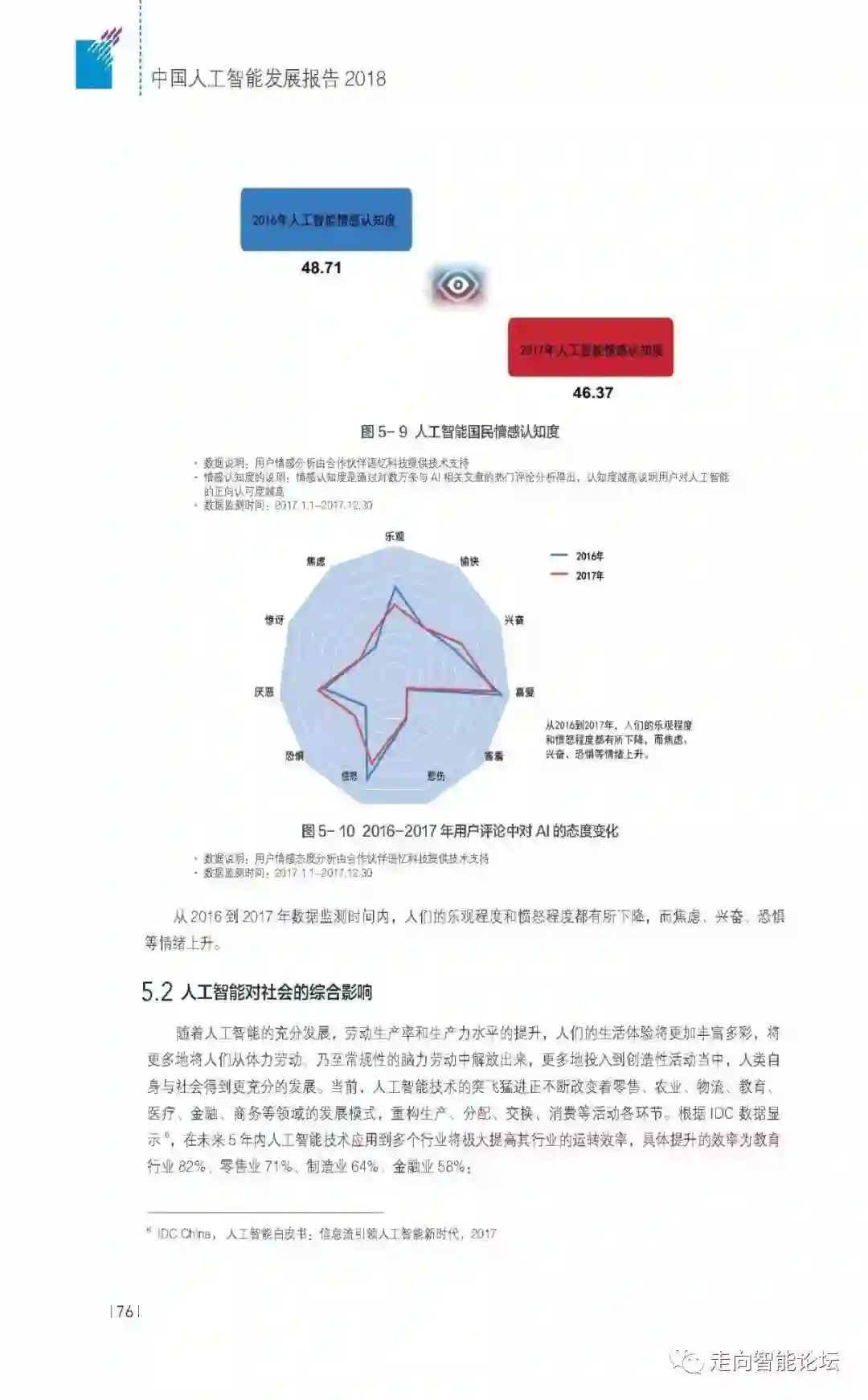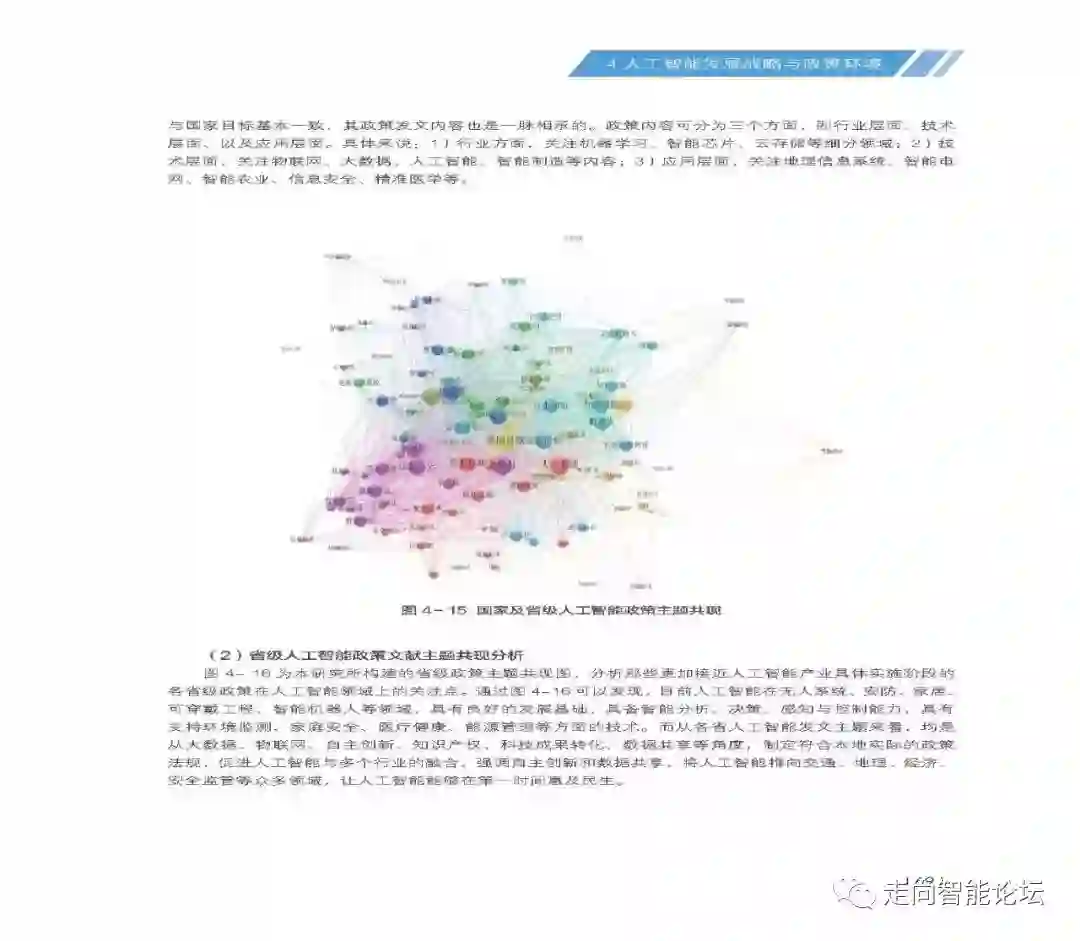 另外,报告还在发展战略和政策环境、社会认知和综合影响方面进行了详细阐述。如,中国人工智能政策主要关注中国制造、创新驱动、物联网、互联网+、大数据、科技研发等六个方面;国民对人工智能认知度高,超半数受访者支持其全面发展;从国际比较来看,中国人工智能发展已经进入国际领先集团,但在人工智能核心技术领域力量依然十分薄弱,顶尖人才缺乏,与发达国家特别是美国的差距还十分明显。
