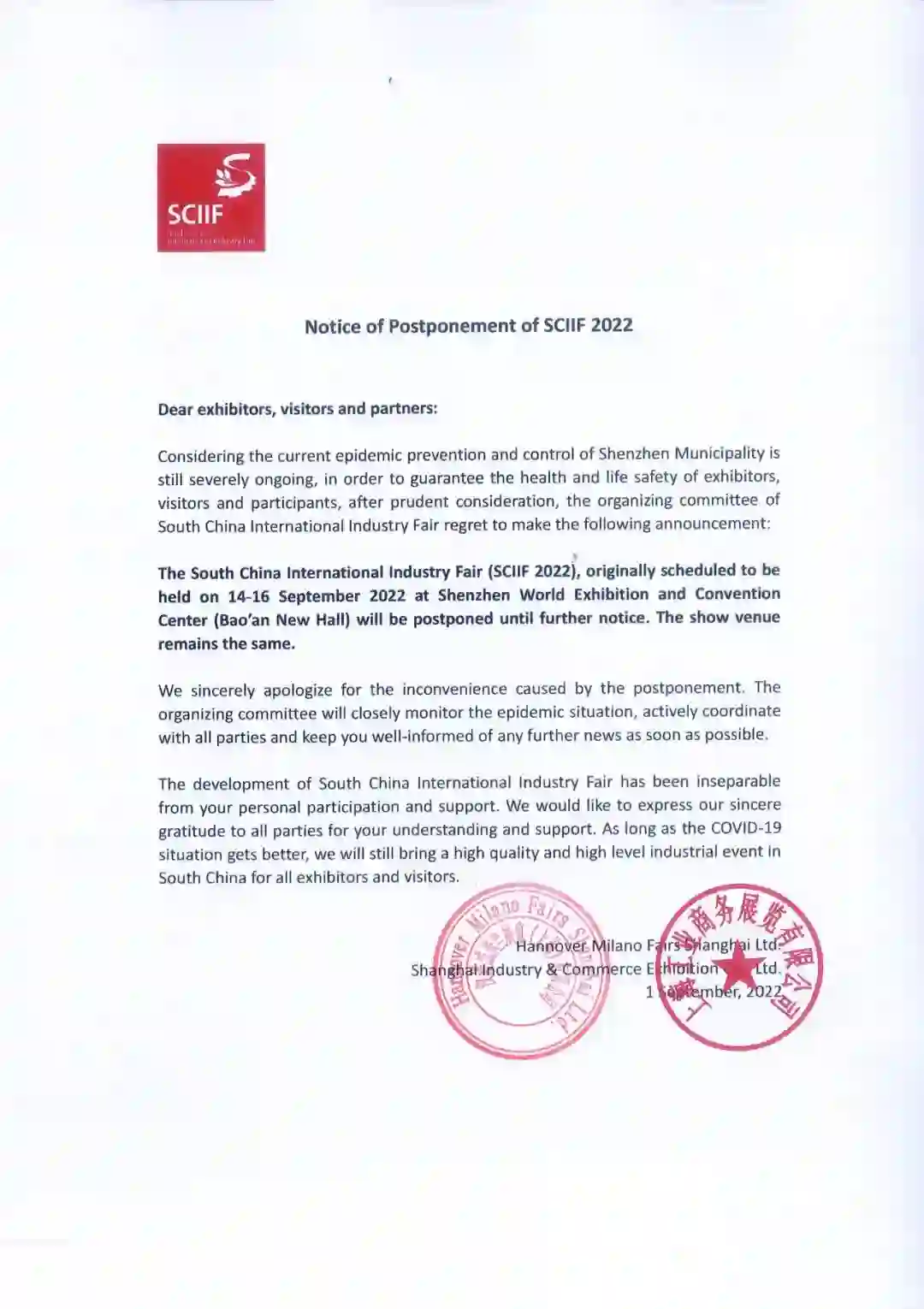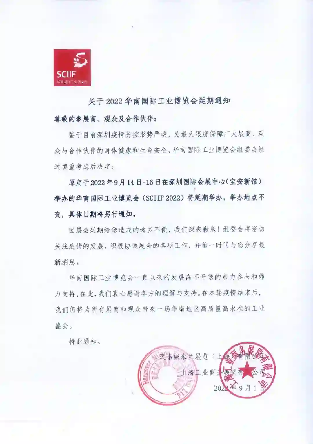 鉴于目前深圳疫情防控形势严峻,为最大限度保障广大展商、观众与合作伙伴的身体健康和生命安全,华南国际工业博览会组委会经过慎重考虑后决定: