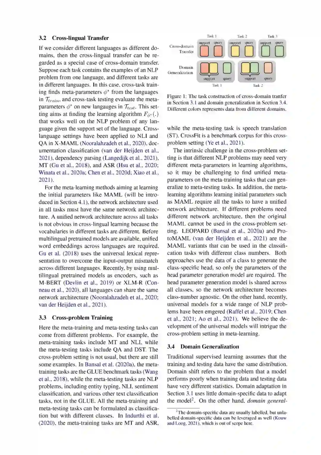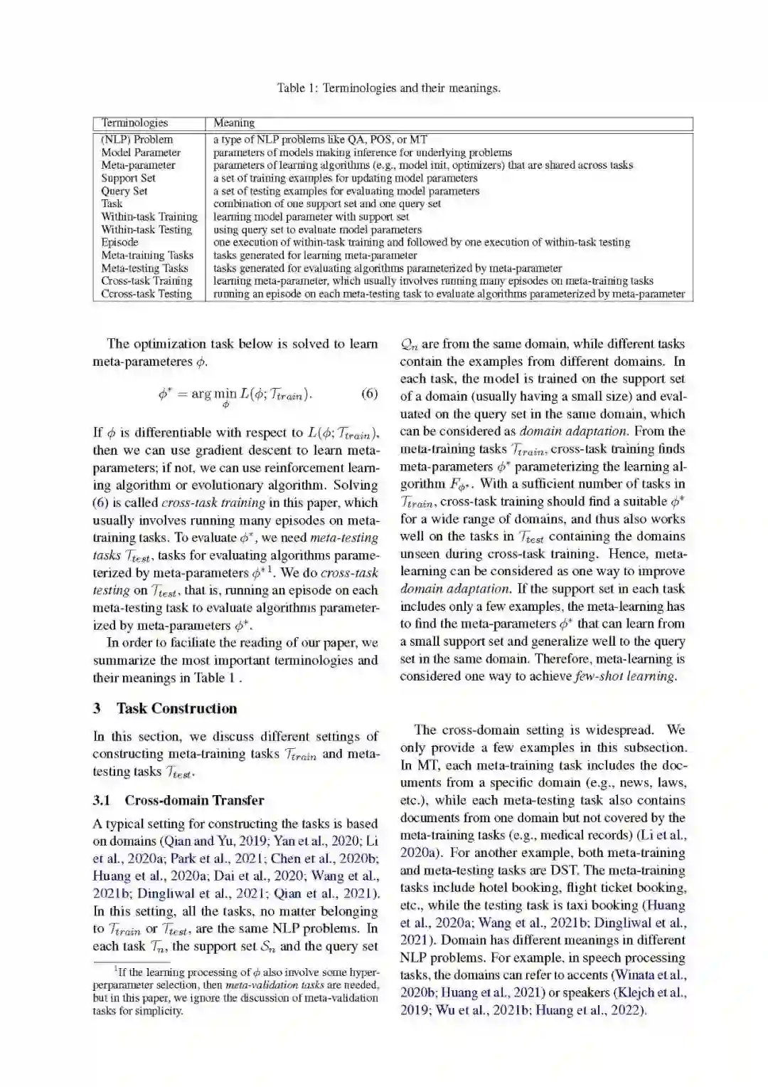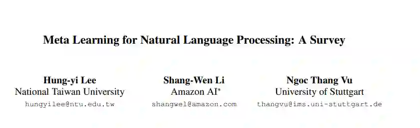 图像处理是具有丰富机器学习应用的领域之一,并且在之前关于元学习的综述论文有很多工作(Hospedales et al., 2021; Huisman et al., 2021)。另一方面,通过将元学习应用于自然语言处理问题,已有研究显示了元学习技术在性能和数据效率方面的优势。请参阅附录中的表3和表4,了解通过元学习改进的自然语言处理应用。ACL2021年会组织教程(Lee et al., 2021b)和研讨会(Lee et al., 2021a),以鼓励对这些技术感兴趣的NLP研究人员之间的交流和合作。在NLP中有一篇关于元学习的综述论文(Yin, 2020)。虽然Yin(2020)对元学习方法进行了概述,但本文侧重于将元学习成功应用于自然语言处理,并对有关自然语言处理元学习的论文进行了更广泛的综述。由于篇幅的限制,在这篇调查论文中,我们将不会对一般的元学习技术进行过多的详细描述。关于元学习的一般概念,我们鼓励读者阅读之前的综述论文(Yin, 2020; Hospedales et al., 2021; Huisman et al., 2021)。