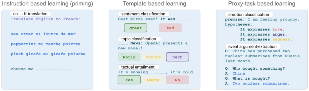 第二类方法的基本想法是通过设计一个模板来把 NLP 任务转换成一个语言模型的预训练任务(例如掩码语言建模,下一个词预测)。图 3(中)给出了三个分别针对情感分类、话题分类和文本蕴含任务设计的模板。论文的 3.2 小节介绍了设计模板和自动生成模板的方法、数值的(continuous) 或者自然语言文字的模板、使用多个模板的方法以及如何把语言模型预测的结果转换成任务相关的标签等。此外,3.2 小节还给出了针对各种 NLP 任务的应用和例子。