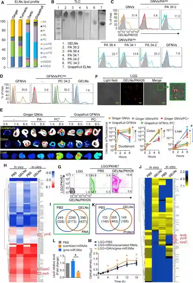 该研究通过匀浆、过滤、多步差速法等步骤从夏威夷生姜根、胡萝卜、大蒜、姜黄根和葡萄柚中提取外泌体样纳米颗粒。后四者为对照。首先发现姜外泌体样纳米颗粒(GELNs)影响肠道微生物群。GELNs可以调节乳杆菌代谢物,所以研究人员选择乳杆菌进一步分析GELN介导的乳杆菌生物学效应的分子机制。姜外泌体样纳米颗粒(GELNs)优先被肠道细菌吸收,导致细菌的组成、定位以及宿主生理学发生变化。富含磷脂酸(PA)的GELNs向鼠李糖乳杆菌(LGG)发送信号,导致优先摄取GELNs。GELNs被肠道细菌选择性摄取后调节乳杆菌mRNA和蛋白质的表达。一旦GELNs被乳杆菌吸收,GELN-RNAs与一组乳杆菌基因相互作用,改变肠道菌群的组成。同时,GELN-RNA处理的乳杆菌释放的代谢物反过来调节其他肠道细菌的生长。