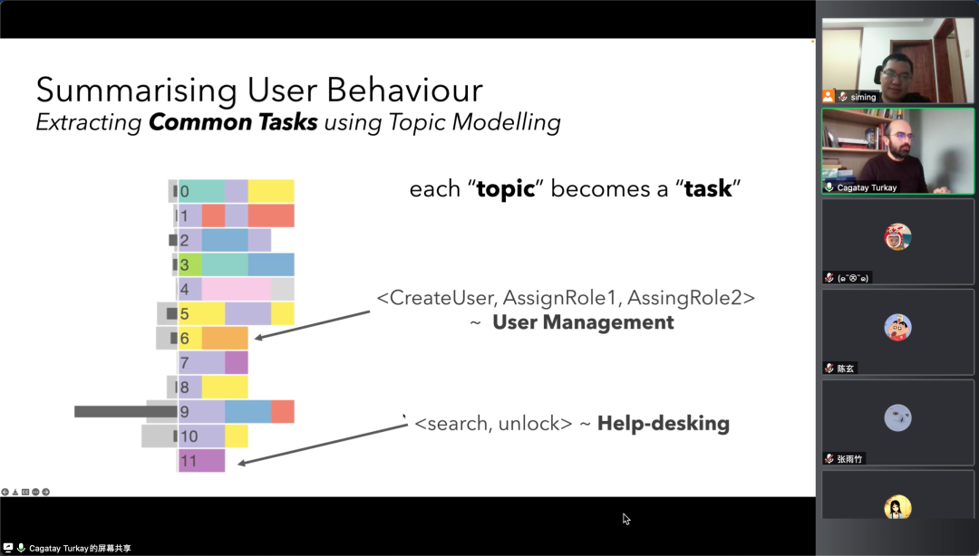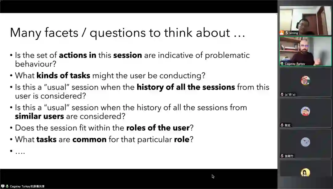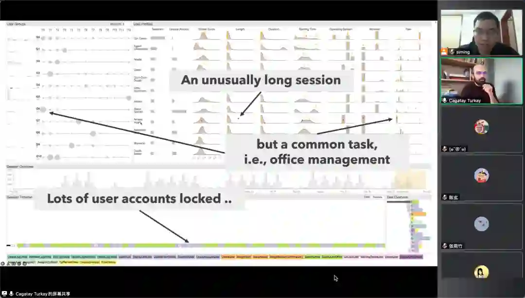 其次,Cagatay教授还介绍了交互式可视分析如何应用于网络安全中对用户行为分析。首先,教授总结了一系列分析难点,比如在一个会话中一系列的动作是否是一种有问题的行为,不同的用户角色是否会有不同的常见任务等(图3)。针对这些的问题,我们需要一个全面且多角度的可视化来支持多方面分析。