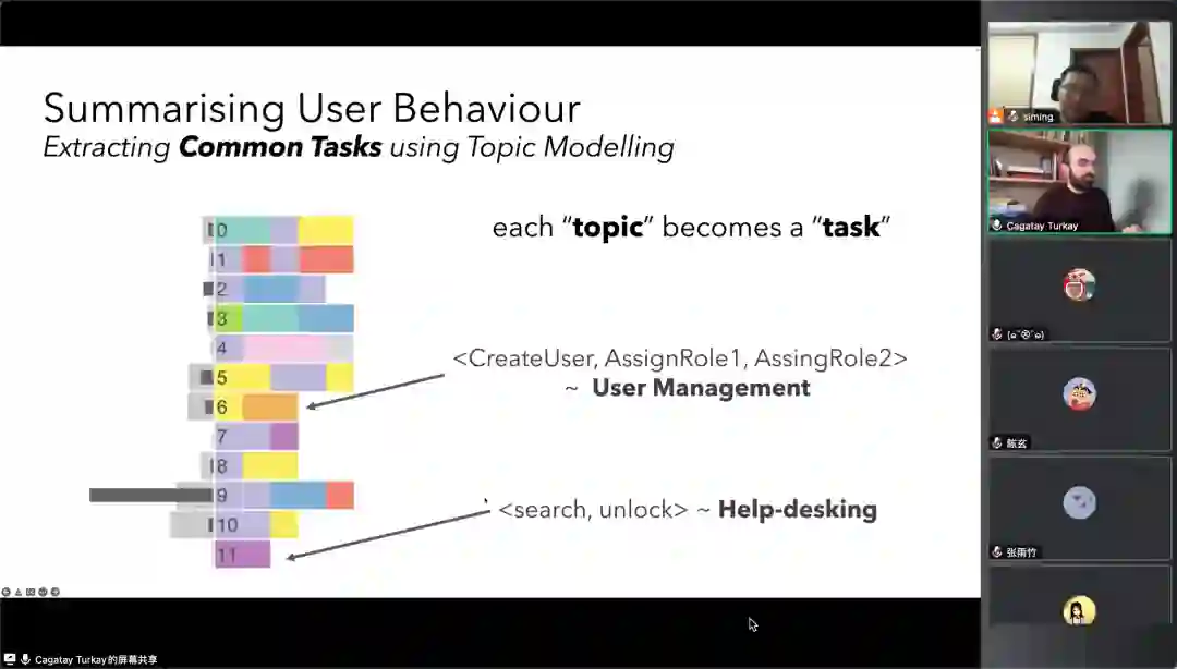 随后,教授介绍了如何利用主题聚类从文本中提取用户行为的常见任务,并将其编码为序列结构,用颜色表示用户动作。通过对用户动作进行主题聚类就能够总结用户的行为(图4)。