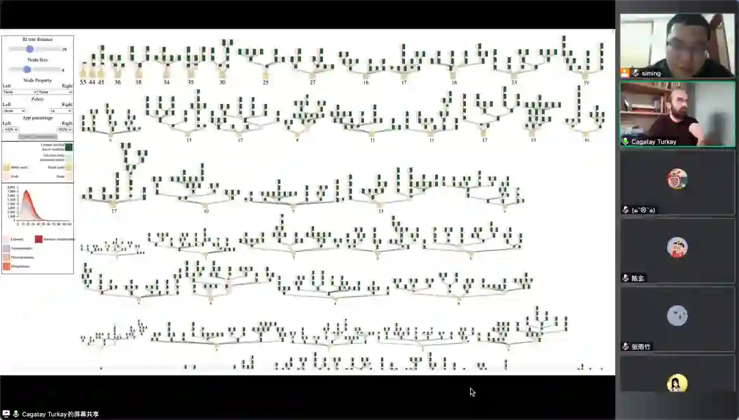 首先,针对如何利用交互式可视化增加数据算法工具的丰富性,Cagatay教授介绍了可视化对于数据分析、增强决策的必要性,并通过一个疫情下的政策分析来举例说明。他指出仅仅观察模型的结果存在的四点问题:难以得知模型内部统计量的变化;难以比较多种政策的不同影响;对于建模者来说模型有时也是不透明的;存在许多感染链,大型网络结构难以清晰的展示和观察传播模式(图1)。