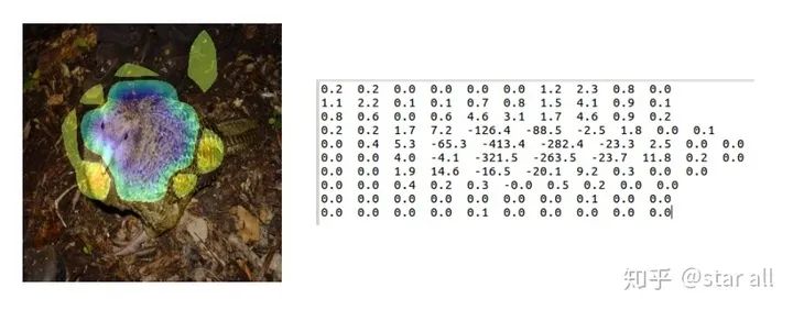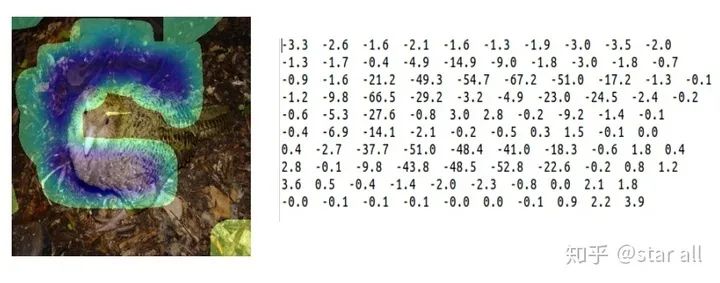 为了方便展示,我把负值的激活用冷色调来显示,把正值的激活用暖色调来显示,所以就是变成了上面两幅激活图的样子。而右边的数字是具体的激活矩阵(把激活矩阵进行GAP就可以变成最终输出的Logits)。