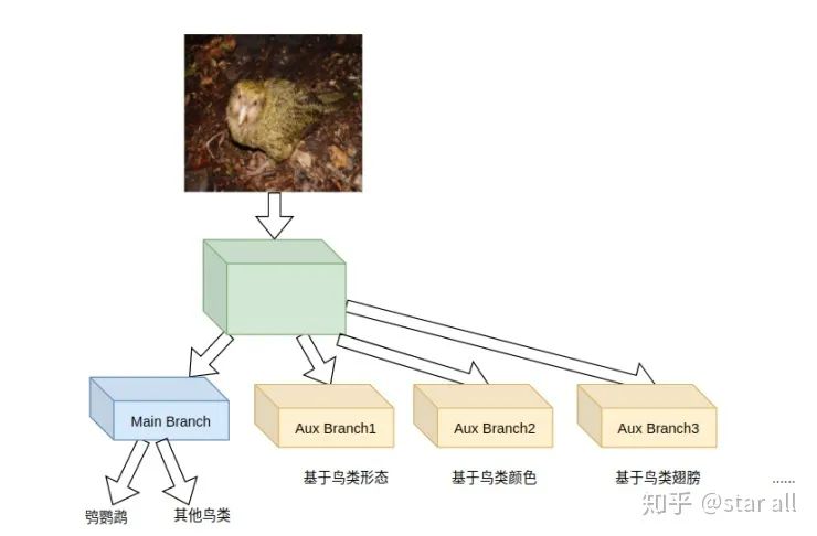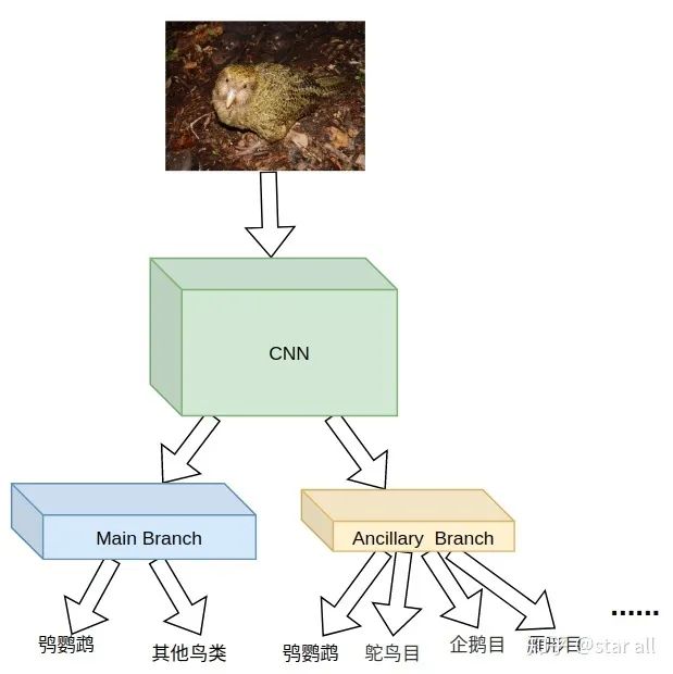 经过实验发现,这种网络架构不能很好的增加主任务的分类精度。为了充分的学到鸮鹦鹉和其他鸟类特征的分别,同时又能带入不同种类鸟类类别的先验,我们引入辅助任务: