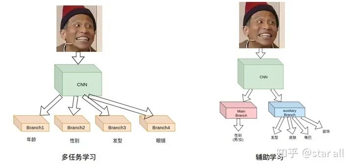上图的左侧是多任务学习的例子,右侧是辅助学习的例子。左侧是个典型的face attribute的task,意思是输入一张人脸,通过多个branch来输出这一张人脸的年龄,性别,发型等等信息,各个branch的任务是独立的,同时又共享同一个backbone。右边是一个典型的辅助学习的task,意思是出入一张人脸,判断这一张人脸的性别,同时另外开一个(或几个)branch,通过这个branch来让网络学一些辅助信息,比如发型,皮肤等等,来帮助网络主任务(分男女)的判别。