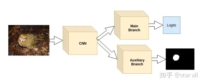 当然直接模仿detection那样去回归出位置来这个任务太heavy了,你可以通过一个生成网络的支路来生成一个鸟类头部位置的Mask,一个简单的示意图如下: