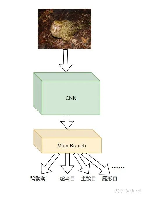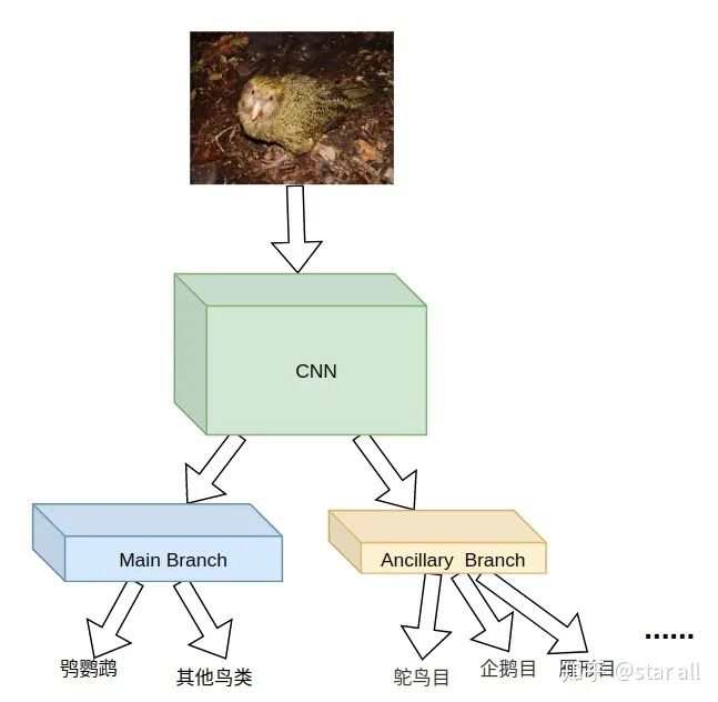 但是从实验效果来看这个Pipeline的精度并不高。经过分析原因,发现在主任务和辅助任务里面都有鸮鹦鹉这一类,这样当回传梯度的时候,相当于把区分鸮鹦鹉和其他鸟类的特征回传了两次梯度,而回传两次梯度明显是没用的,而且会干扰辅助任务学习不同其他鸟类的特征。