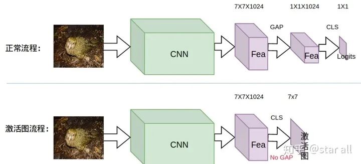 CAM[1]激活图是基于分类网络的倒数第二层卷积层的输出的 feature_map 的线性加权,权重就是最后一层分类层的权重,由于分类层的权重编码了类别的信息,所以加权后的响应图就有了基于不同类别的区域相应。(具体的介绍可以看 https://zhuanlan.zhihu.com/p/51631163),具体的激活图生成方式可以如下表示: