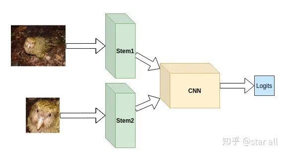 这时怎么让网络更加关注鸮鹦鹉的头部呢。这时你可以这样做,把整个鸮鹦鹉和它的头部作为一个网络的两路输入,在网咯的后端再把两路输入的信息融合。以达到既关注局域,又关注整体的目的。一个简单的示意图如下所示。