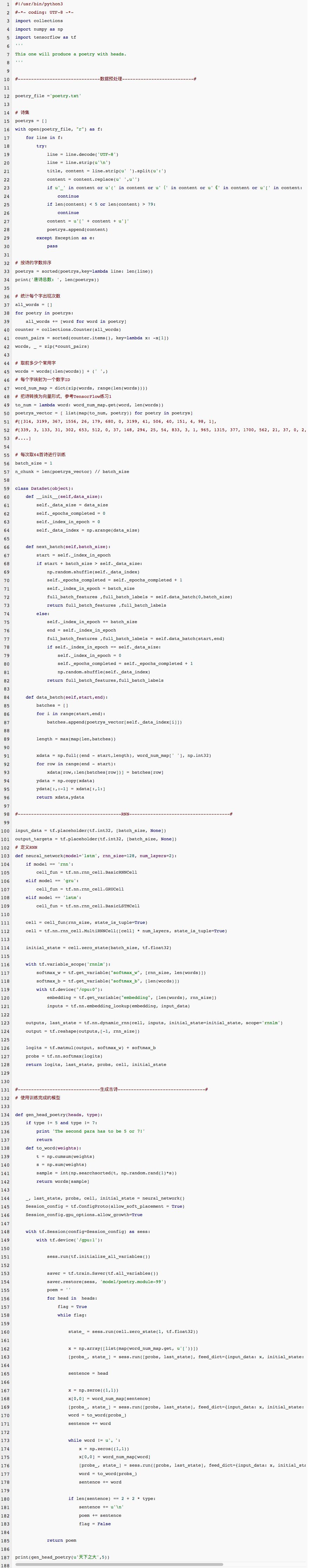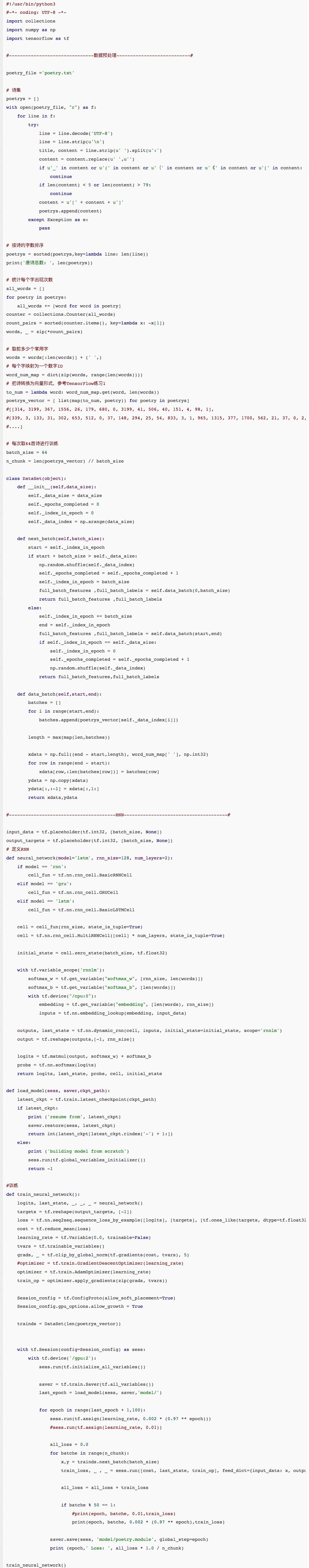 首先我们要训练好模型。这里采用的是2层的LSTM框架,每层有128个隐藏层节点,batch_size设为64。训练数据来源于全唐诗(可在上面百度云资源分享当中找到)。特别注意到的一点是这里每训练完一次就对训练数据做shuffle。