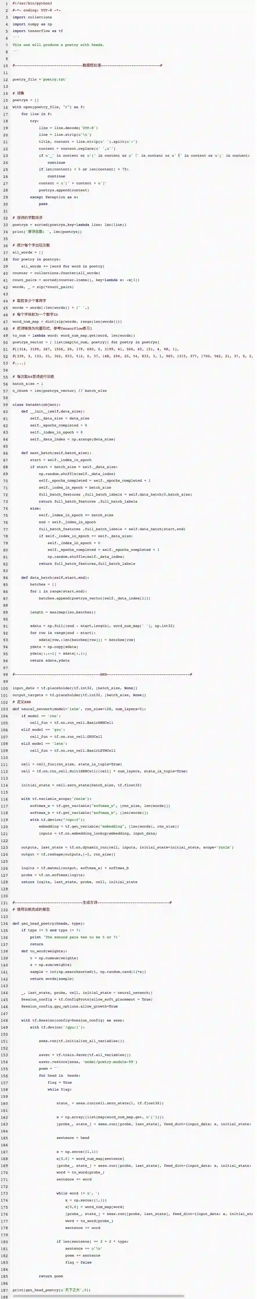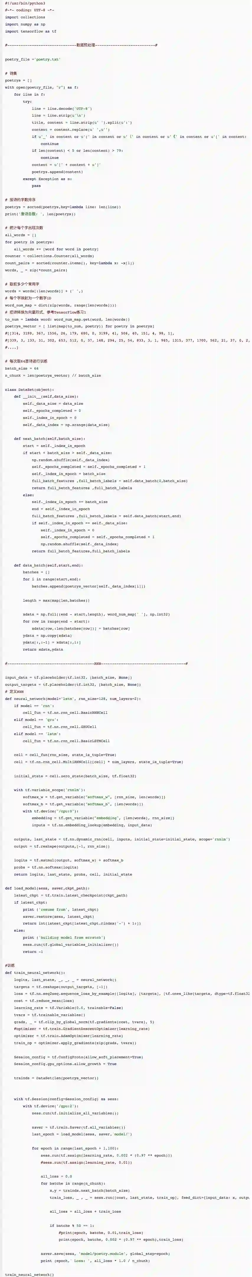 例如本帖要使用RNN生成古诗,你给它输入一堆古诗词,它会学着生成和前面相关联的字词。如果你给它输入一堆姓名,它会学着生成姓名;给它输入一堆古典乐/歌词,它会学着生成古典乐/歌词,甚至可以给它输入源代码。