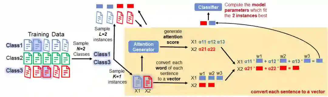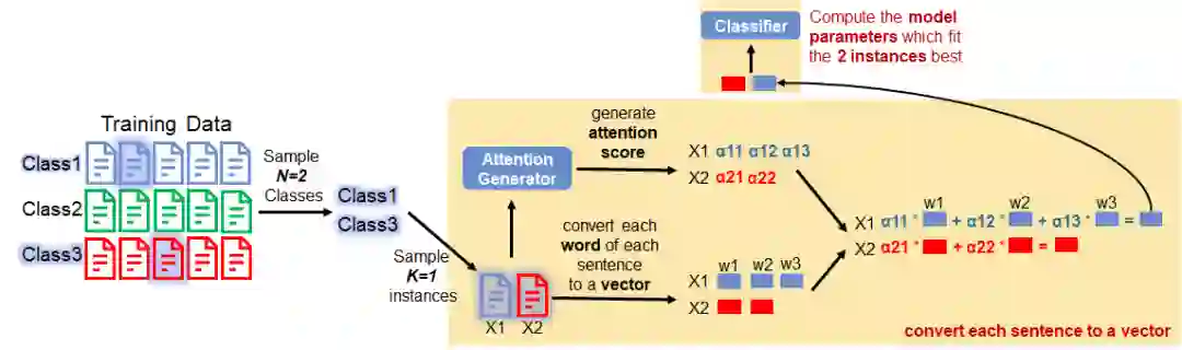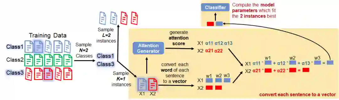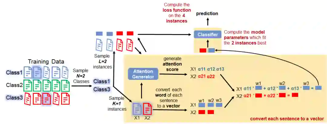 We then feed these vectors to the classifier. Based on the predicted results, we compute the loss function (i.e., cross-entropy) on the instances in the query set and subsequently update the model parameters.
