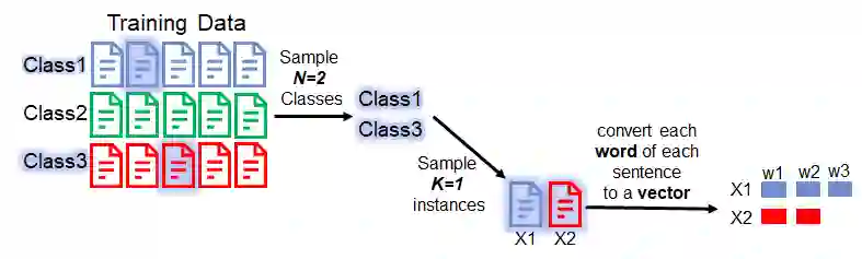 We sample N classes from all the classes in the dataset. (Please note: here we use N=2 just for the purpose of demonstrating. It doesn't mean in practice N=2 is a good setting. Please find how many classes exactly sampled in their paper.)