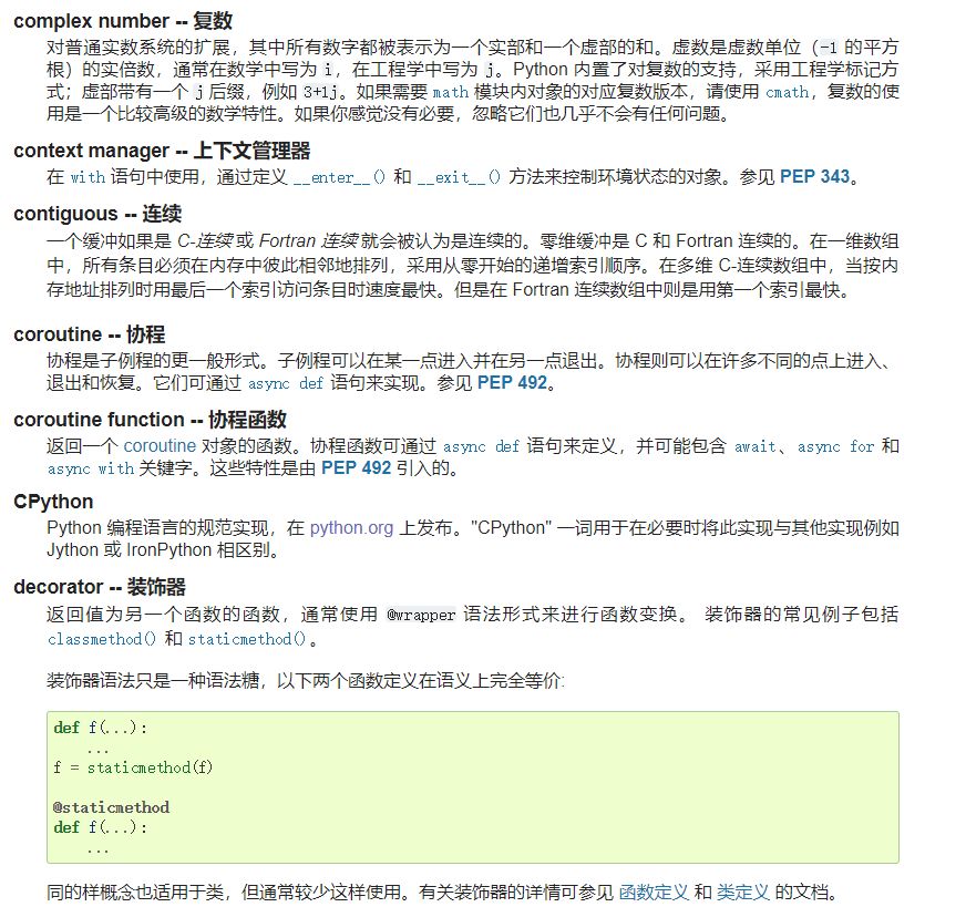 最后,Python 中文文档还有个小彩蛋,它把 Python 中的术语都翻了一遍。很多时候,这些术语都有不同的译文与表达方式,例如 decorator 既可以保留原文,也可以翻成装饰器或修饰器。也许以后,这一份官方词汇表可以帮助我们找到更合适的表达方式。