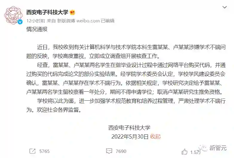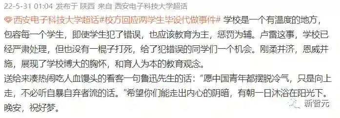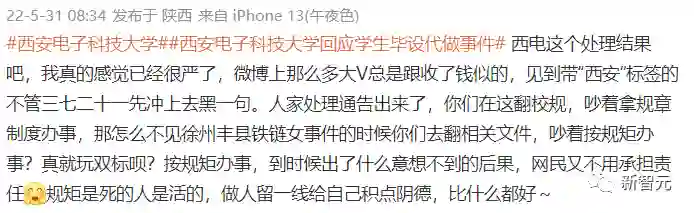 在通报公布之前,众矢之的是买毕设还反手勒索枪手的学生;在通报公布之后,众矢之的合理地变成了西电这学校。