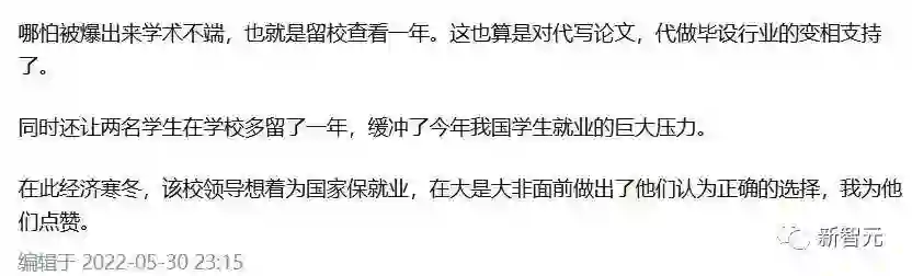 有人称,西电校方既支持了论文买卖业的货币流动性,又用延毕缓解了毕业生就业压力,为中国经济的保增长促发展做出了不可磨灭的贡献。