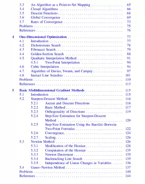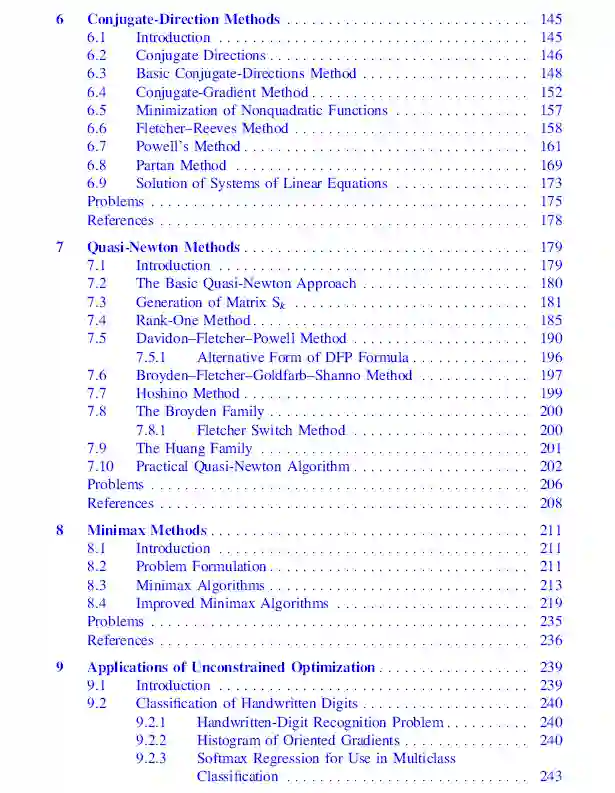 第一章简要介绍了优化和优化算法的一般结构。第2章到第9章涉及无约束优化方法。第二章介绍了局部极小化的一阶和二阶必要条件、二阶充分条件和凸函数的优化。第三章讨论了算法的一般性质,如下降函数、全局收敛和收敛速度的概念。第四章介绍了一维优化的几种方法,通常称为直线搜索。本章还讨论了在许多优化算法中提高效率的非精确直线搜索方法。第五章介绍了几种基本的梯度方法,包括最陡下降法、牛顿法和高斯-牛顿法。第六章给出了一类基于共轭方向概念的方法,如共轭梯度法、Fletcher-Reeves法、Powell法和Partan法。第7章介绍了一类重要的无约束优化方法,即拟牛顿方法。研究了该类的代表性方法Davidon-Fletcher-Powell和Broydon-Fletcher-Goldfarb-Shanno方法及其性质。本章还包括一个实用、高效、可靠的准牛顿算法,它消除了与基本准牛顿法相关的一些问题。第8章介绍了在许多应用中使用的极小极大方法,包括数字滤波器的设计。第9章给出了3个案例研究,将第4章到第8章中描述的几种无约束优化方法应用于点模式匹配、机器人机械手逆运动学和数字滤波器的设计。